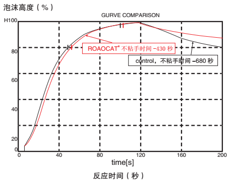 ◆ 當使用0.35 份ROAOCAT®601 和0.25 份ROAOCAT®602(總計,0.60 份)替代0.20 份催化劑A、0.20 份催化劑B 和0.10 份ROAOCAT®33V(總計,0.50),脫膜時間可從4.5 分鐘縮短到3.5 分鐘,同時具相似的操作特性