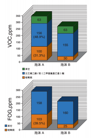 以上測(cè)試的泡沫A,B 是異氰酸酯指數(shù)為100,密度為40kg/m3 的TDI/MDI=80/20 泡沫體系。說明: