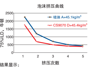 脫模后,一分鐘后連續(xù)五次測(cè)試泡沫的75% 的壓陷硬度,第一次和δ(第一次與第二次的差值)可表征體系的開孔特性。